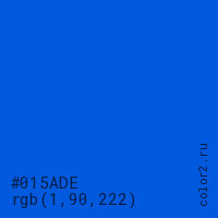Цвет #015ADE в цветовой модели RGB обозначается тремя октетами (1, 90, 222) в десятичном формате и #015ADE в шестнадцатиричном (hex) формате, которые являются интенсивностью красного 1 (hex 01), интенсивность зелёного 90 (hex 5A) и интенсивность синего 222 (hex DE).