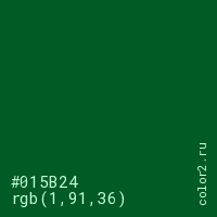Цвет #015B24 в цветовой модели RGB обозначается тремя октетами (1, 91, 36) в десятичном формате и #015B24 в шестнадцатиричном (hex) формате, которые являются интенсивностью красного 1 (hex 01), интенсивность зелёного 91 (hex 5B) и интенсивность синего 36 (hex 24).