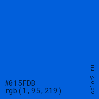 Цвет #015FDB в цветовой модели RGB обозначается тремя октетами (1, 95, 219) в десятичном формате и #015FDB в шестнадцатиричном (hex) формате, которые являются интенсивностью красного 1 (hex 01), интенсивность зелёного 95 (hex 5F) и интенсивность синего 219 (hex DB).