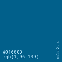 Цвет #01608B в цветовой модели RGB обозначается тремя октетами (1, 96, 139) в десятичном формате и #01608B в шестнадцатиричном (hex) формате, которые являются интенсивностью красного 1 (hex 01), интенсивность зелёного 96 (hex 60) и интенсивность синего 139 (hex 8B).