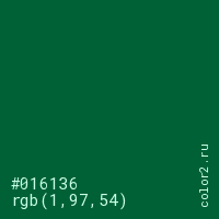Цвет #016136 в цветовой модели RGB обозначается тремя октетами (1, 97, 54) в десятичном формате и #016136 в шестнадцатиричном (hex) формате, которые являются интенсивностью красного 1 (hex 01), интенсивность зелёного 97 (hex 61) и интенсивность синего 54 (hex 36).