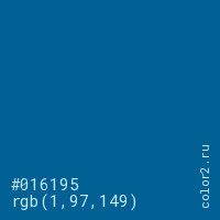 Цвет #016195 в цветовой модели RGB обозначается тремя октетами (1, 97, 149) в десятичном формате и #016195 в шестнадцатиричном (hex) формате, которые являются интенсивностью красного 1 (hex 01), интенсивность зелёного 97 (hex 61) и интенсивность синего 149 (hex 95).