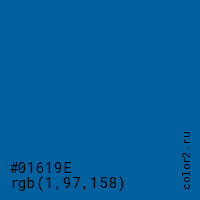 Цвет #01619E в цветовой модели RGB обозначается тремя октетами (1, 97, 158) в десятичном формате и #01619E в шестнадцатиричном (hex) формате, которые являются интенсивностью красного 1 (hex 01), интенсивность зелёного 97 (hex 61) и интенсивность синего 158 (hex 9E).