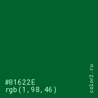 Цвет #01622E в цветовой модели RGB обозначается тремя октетами (1, 98, 46) в десятичном формате и #01622E в шестнадцатиричном (hex) формате, которые являются интенсивностью красного 1 (hex 01), интенсивность зелёного 98 (hex 62) и интенсивность синего 46 (hex 2E).