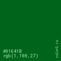 Цвет #01641B в цветовой модели RGB обозначается тремя октетами (1, 100, 27) в десятичном формате и #01641B в шестнадцатиричном (hex) формате, которые являются интенсивностью красного 1 (hex 01), интенсивность зелёного 100 (hex 64) и интенсивность синего 27 (hex 1B).