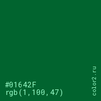 Цвет #01642F в цветовой модели RGB обозначается тремя октетами (1, 100, 47) в десятичном формате и #01642F в шестнадцатиричном (hex) формате, которые являются интенсивностью красного 1 (hex 01), интенсивность зелёного 100 (hex 64) и интенсивность синего 47 (hex 2F).