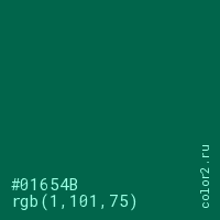Цвет #01654B в цветовой модели RGB обозначается тремя октетами (1, 101, 75) в десятичном формате и #01654B в шестнадцатиричном (hex) формате, которые являются интенсивностью красного 1 (hex 01), интенсивность зелёного 101 (hex 65) и интенсивность синего 75 (hex 4B).