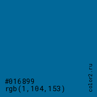 Цвет #016899 в цветовой модели RGB обозначается тремя октетами (1, 104, 153) в десятичном формате и #016899 в шестнадцатиричном (hex) формате, которые являются интенсивностью красного 1 (hex 01), интенсивность зелёного 104 (hex 68) и интенсивность синего 153 (hex 99).