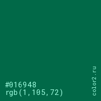 Цвет #016948 в цветовой модели RGB обозначается тремя октетами (1, 105, 72) в десятичном формате и #016948 в шестнадцатиричном (hex) формате, которые являются интенсивностью красного 1 (hex 01), интенсивность зелёного 105 (hex 69) и интенсивность синего 72 (hex 48).