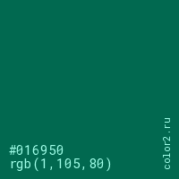 Цвет #016950 в цветовой модели RGB обозначается тремя октетами (1, 105, 80) в десятичном формате и #016950 в шестнадцатиричном (hex) формате, которые являются интенсивностью красного 1 (hex 01), интенсивность зелёного 105 (hex 69) и интенсивность синего 80 (hex 50).