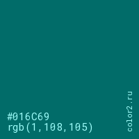 Цвет #016C69 в цветовой модели RGB обозначается тремя октетами (1, 108, 105) в десятичном формате и #016C69 в шестнадцатиричном (hex) формате, которые являются интенсивностью красного 1 (hex 01), интенсивность зелёного 108 (hex 6C) и интенсивность синего 105 (hex 69).