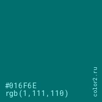 Цвет #016F6E в цветовой модели RGB обозначается тремя октетами (1, 111, 110) в десятичном формате и #016F6E в шестнадцатиричном (hex) формате, которые являются интенсивностью красного 1 (hex 01), интенсивность зелёного 111 (hex 6F) и интенсивность синего 110 (hex 6E).