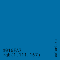 Цвет #016FA7 в цветовой модели RGB обозначается тремя октетами (1, 111, 167) в десятичном формате и #016FA7 в шестнадцатиричном (hex) формате, которые являются интенсивностью красного 1 (hex 01), интенсивность зелёного 111 (hex 6F) и интенсивность синего 167 (hex A7).
