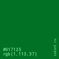 Цвет #017125 в цветовой модели RGB обозначается тремя октетами (1, 113, 37) в десятичном формате и #017125 в шестнадцатиричном (hex) формате, которые являются интенсивностью красного 1 (hex 01), интенсивность зелёного 113 (hex 71) и интенсивность синего 37 (hex 25).