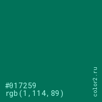 Цвет #017259 в цветовой модели RGB обозначается тремя октетами (1, 114, 89) в десятичном формате и #017259 в шестнадцатиричном (hex) формате, которые являются интенсивностью красного 1 (hex 01), интенсивность зелёного 114 (hex 72) и интенсивность синего 89 (hex 59).