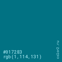 Цвет #017283 в цветовой модели RGB обозначается тремя октетами (1, 114, 131) в десятичном формате и #017283 в шестнадцатиричном (hex) формате, которые являются интенсивностью красного 1 (hex 01), интенсивность зелёного 114 (hex 72) и интенсивность синего 131 (hex 83).