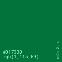 Цвет #01733B в цветовой модели RGB обозначается тремя октетами (1, 115, 59) в десятичном формате и #01733B в шестнадцатиричном (hex) формате, которые являются интенсивностью красного 1 (hex 01), интенсивность зелёного 115 (hex 73) и интенсивность синего 59 (hex 3B).