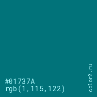 Цвет #01737A в цветовой модели RGB обозначается тремя октетами (1, 115, 122) в десятичном формате и #01737A в шестнадцатиричном (hex) формате, которые являются интенсивностью красного 1 (hex 01), интенсивность зелёного 115 (hex 73) и интенсивность синего 122 (hex 7A).