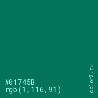 Цвет #01745B в цветовой модели RGB обозначается тремя октетами (1, 116, 91) в десятичном формате и #01745B в шестнадцатиричном (hex) формате, которые являются интенсивностью красного 1 (hex 01), интенсивность зелёного 116 (hex 74) и интенсивность синего 91 (hex 5B).