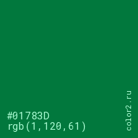 Цвет #01783D в цветовой модели RGB обозначается тремя октетами (1, 120, 61) в десятичном формате и #01783D в шестнадцатиричном (hex) формате, которые являются интенсивностью красного 1 (hex 01), интенсивность зелёного 120 (hex 78) и интенсивность синего 61 (hex 3D).