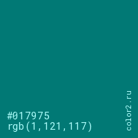 Цвет #017975 в цветовой модели RGB обозначается тремя октетами (1, 121, 117) в десятичном формате и #017975 в шестнадцатиричном (hex) формате, которые являются интенсивностью красного 1 (hex 01), интенсивность зелёного 121 (hex 79) и интенсивность синего 117 (hex 75).