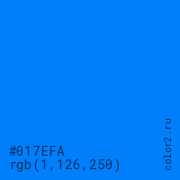 Цвет #017EFA в цветовой модели RGB обозначается тремя октетами (1, 126, 250) в десятичном формате и #017EFA в шестнадцатиричном (hex) формате, которые являются интенсивностью красного 1 (hex 01), интенсивность зелёного 126 (hex 7E) и интенсивность синего 250 (hex FA).