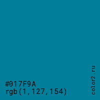 Цвет #017F9A в цветовой модели RGB обозначается тремя октетами (1, 127, 154) в десятичном формате и #017F9A в шестнадцатиричном (hex) формате, которые являются интенсивностью красного 1 (hex 01), интенсивность зелёного 127 (hex 7F) и интенсивность синего 154 (hex 9A).