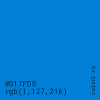Цвет #017FD8 в цветовой модели RGB обозначается тремя октетами (1, 127, 216) в десятичном формате и #017FD8 в шестнадцатиричном (hex) формате, которые являются интенсивностью красного 1 (hex 01), интенсивность зелёного 127 (hex 7F) и интенсивность синего 216 (hex D8).