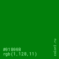 Цвет #01800B в цветовой модели RGB обозначается тремя октетами (1, 128, 11) в десятичном формате и #01800B в шестнадцатиричном (hex) формате, которые являются интенсивностью красного 1 (hex 01), интенсивность зелёного 128 (hex 80) и интенсивность синего 11 (hex 0B).