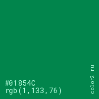 Цвет #01854C в цветовой модели RGB обозначается тремя октетами (1, 133, 76) в десятичном формате и #01854C в шестнадцатиричном (hex) формате, которые являются интенсивностью красного 1 (hex 01), интенсивность зелёного 133 (hex 85) и интенсивность синего 76 (hex 4C).