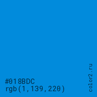 Цвет #018BDC в цветовой модели RGB обозначается тремя октетами (1, 139, 220) в десятичном формате и #018BDC в шестнадцатиричном (hex) формате, которые являются интенсивностью красного 1 (hex 01), интенсивность зелёного 139 (hex 8B) и интенсивность синего 220 (hex DC).