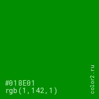 Цвет #018E01 в цветовой модели RGB обозначается тремя октетами (1, 142, 1) в десятичном формате и #018E01 в шестнадцатиричном (hex) формате, которые являются интенсивностью красного 1 (hex 01), интенсивность зелёного 142 (hex 8E) и интенсивность синего 1 (hex 01).