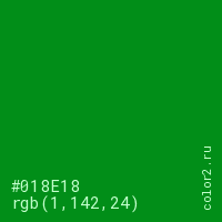 Цвет #018E18 в цветовой модели RGB обозначается тремя октетами (1, 142, 24) в десятичном формате и #018E18 в шестнадцатиричном (hex) формате, которые являются интенсивностью красного 1 (hex 01), интенсивность зелёного 142 (hex 8E) и интенсивность синего 24 (hex 18).