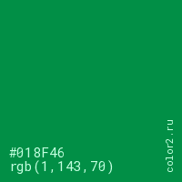 Цвет #018F46 в цветовой модели RGB обозначается тремя октетами (1, 143, 70) в десятичном формате и #018F46 в шестнадцатиричном (hex) формате, которые являются интенсивностью красного 1 (hex 01), интенсивность зелёного 143 (hex 8F) и интенсивность синего 70 (hex 46).