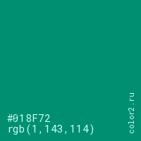 Цвет #018F72 в цветовой модели RGB обозначается тремя октетами (1, 143, 114) в десятичном формате и #018F72 в шестнадцатиричном (hex) формате, которые являются интенсивностью красного 1 (hex 01), интенсивность зелёного 143 (hex 8F) и интенсивность синего 114 (hex 72).