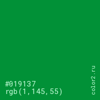 Цвет #019137 в цветовой модели RGB обозначается тремя октетами (1, 145, 55) в десятичном формате и #019137 в шестнадцатиричном (hex) формате, которые являются интенсивностью красного 1 (hex 01), интенсивность зелёного 145 (hex 91) и интенсивность синего 55 (hex 37).