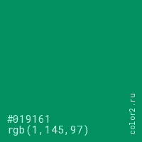 Цвет #019161 в цветовой модели RGB обозначается тремя октетами (1, 145, 97) в десятичном формате и #019161 в шестнадцатиричном (hex) формате, которые являются интенсивностью красного 1 (hex 01), интенсивность зелёного 145 (hex 91) и интенсивность синего 97 (hex 61).