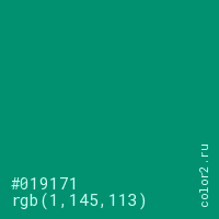 Цвет #019171 в цветовой модели RGB обозначается тремя октетами (1, 145, 113) в десятичном формате и #019171 в шестнадцатиричном (hex) формате, которые являются интенсивностью красного 1 (hex 01), интенсивность зелёного 145 (hex 91) и интенсивность синего 113 (hex 71).