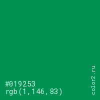 Цвет #019253 в цветовой модели RGB обозначается тремя октетами (1, 146, 83) в десятичном формате и #019253 в шестнадцатиричном (hex) формате, которые являются интенсивностью красного 1 (hex 01), интенсивность зелёного 146 (hex 92) и интенсивность синего 83 (hex 53).