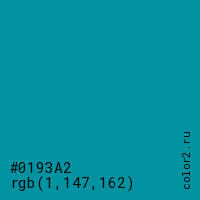 Цвет #0193A2 в цветовой модели RGB обозначается тремя октетами (1, 147, 162) в десятичном формате и #0193A2 в шестнадцатиричном (hex) формате, которые являются интенсивностью красного 1 (hex 01), интенсивность зелёного 147 (hex 93) и интенсивность синего 162 (hex A2).