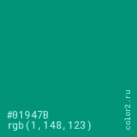 Цвет #01947B в цветовой модели RGB обозначается тремя октетами (1, 148, 123) в десятичном формате и #01947B в шестнадцатиричном (hex) формате, которые являются интенсивностью красного 1 (hex 01), интенсивность зелёного 148 (hex 94) и интенсивность синего 123 (hex 7B).