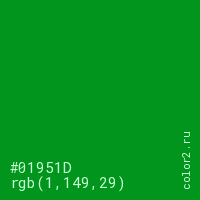 Цвет #01951D в цветовой модели RGB обозначается тремя октетами (1, 149, 29) в десятичном формате и #01951D в шестнадцатиричном (hex) формате, которые являются интенсивностью красного 1 (hex 01), интенсивность зелёного 149 (hex 95) и интенсивность синего 29 (hex 1D).