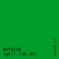 Цвет #019C2B в цветовой модели RGB обозначается тремя октетами (1, 156, 43) в десятичном формате и #019C2B в шестнадцатиричном (hex) формате, которые являются интенсивностью красного 1 (hex 01), интенсивность зелёного 156 (hex 9C) и интенсивность синего 43 (hex 2B).