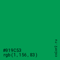 Цвет #019C53 в цветовой модели RGB обозначается тремя октетами (1, 156, 83) в десятичном формате и #019C53 в шестнадцатиричном (hex) формате, которые являются интенсивностью красного 1 (hex 01), интенсивность зелёного 156 (hex 9C) и интенсивность синего 83 (hex 53).