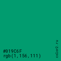 Цвет #019C6F в цветовой модели RGB обозначается тремя октетами (1, 156, 111) в десятичном формате и #019C6F в шестнадцатиричном (hex) формате, которые являются интенсивностью красного 1 (hex 01), интенсивность зелёного 156 (hex 9C) и интенсивность синего 111 (hex 6F).