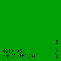 Цвет #01A105 в цветовой модели RGB обозначается тремя октетами (1, 161, 5) в десятичном формате и #01A105 в шестнадцатиричном (hex) формате, которые являются интенсивностью красного 1 (hex 01), интенсивность зелёного 161 (hex A1) и интенсивность синего 5 (hex 05).