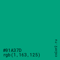 Цвет #01A37D в цветовой модели RGB обозначается тремя октетами (1, 163, 125) в десятичном формате и #01A37D в шестнадцатиричном (hex) формате, которые являются интенсивностью красного 1 (hex 01), интенсивность зелёного 163 (hex A3) и интенсивность синего 125 (hex 7D).