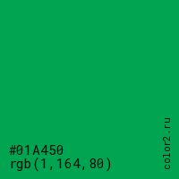 Цвет #01A450 в цветовой модели RGB обозначается тремя октетами (1, 164, 80) в десятичном формате и #01A450 в шестнадцатиричном (hex) формате, которые являются интенсивностью красного 1 (hex 01), интенсивность зелёного 164 (hex A4) и интенсивность синего 80 (hex 50).