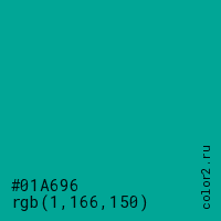 Цвет #01A696 в цветовой модели RGB обозначается тремя октетами (1, 166, 150) в десятичном формате и #01A696 в шестнадцатиричном (hex) формате, которые являются интенсивностью красного 1 (hex 01), интенсивность зелёного 166 (hex A6) и интенсивность синего 150 (hex 96).