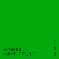 Цвет #01AB0B в цветовой модели RGB обозначается тремя октетами (1, 171, 11) в десятичном формате и #01AB0B в шестнадцатиричном (hex) формате, которые являются интенсивностью красного 1 (hex 01), интенсивность зелёного 171 (hex AB) и интенсивность синего 11 (hex 0B).